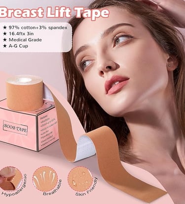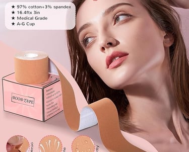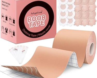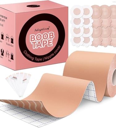 Body tape (or boob tape) is a strong, flexible adhesive tape that lifts and shapes breasts without a bra. It’s ideal for deep necklines, plunging backs, or outfits where nipple covers alone aren’t enough.